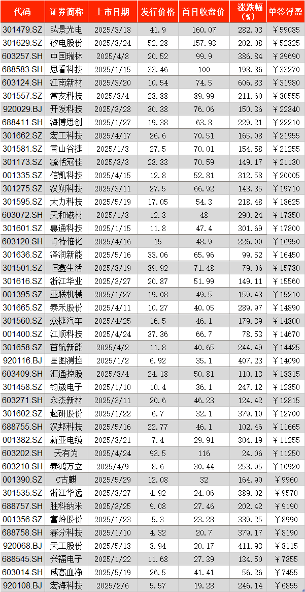 前5月A股新股首日“0”破发:超七成单签浮盈过万,最高5.91万综合