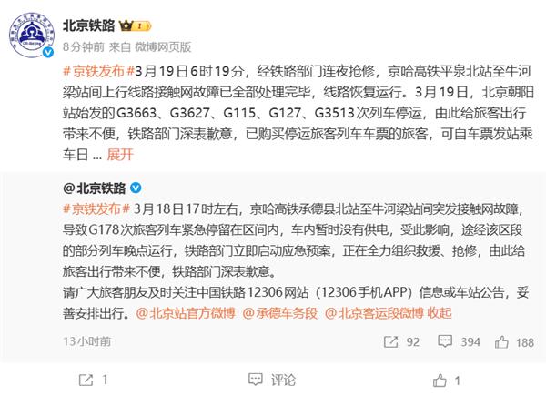 京哈高铁突发接触网故障多列车紧急停运!官方通报综合