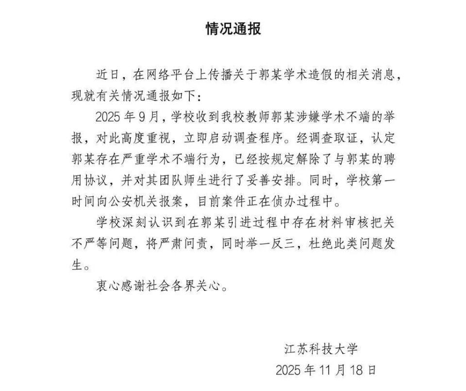 近日,江苏科技大学材料科学与工程学院原教授郭某被指学术履历造假一事引发广泛关注。11月18日,江苏科...