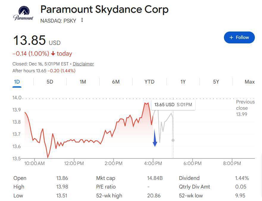 • 派拉蒙1080亿报价截胡奈飞失败?华纳据称本周将拒绝收购要约