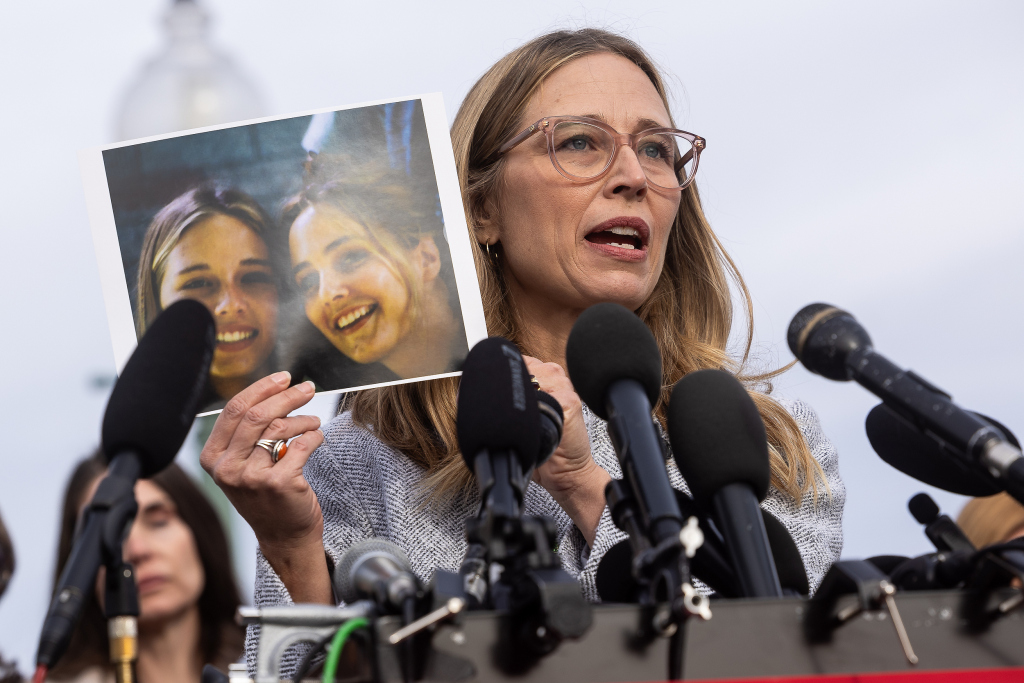当地时间2025年11月18日,美国华盛顿,美国国会大厦外,安妮·法默手持她和妹妹玛丽亚·法默的照片...