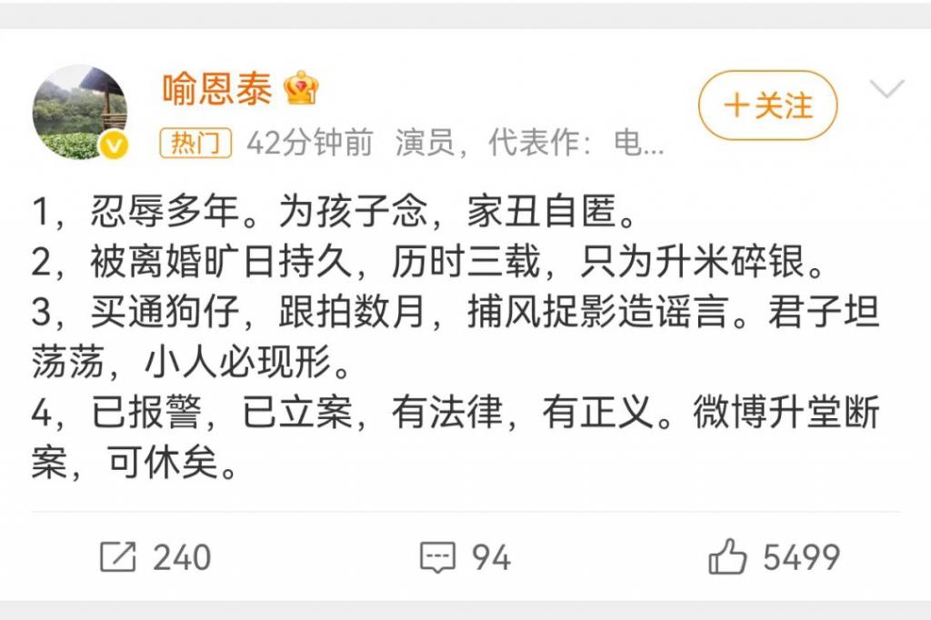 “吕秀才”喻恩泰回应离婚风波:忍辱多年,已报警,已立案,对方买通狗仔造谣综合