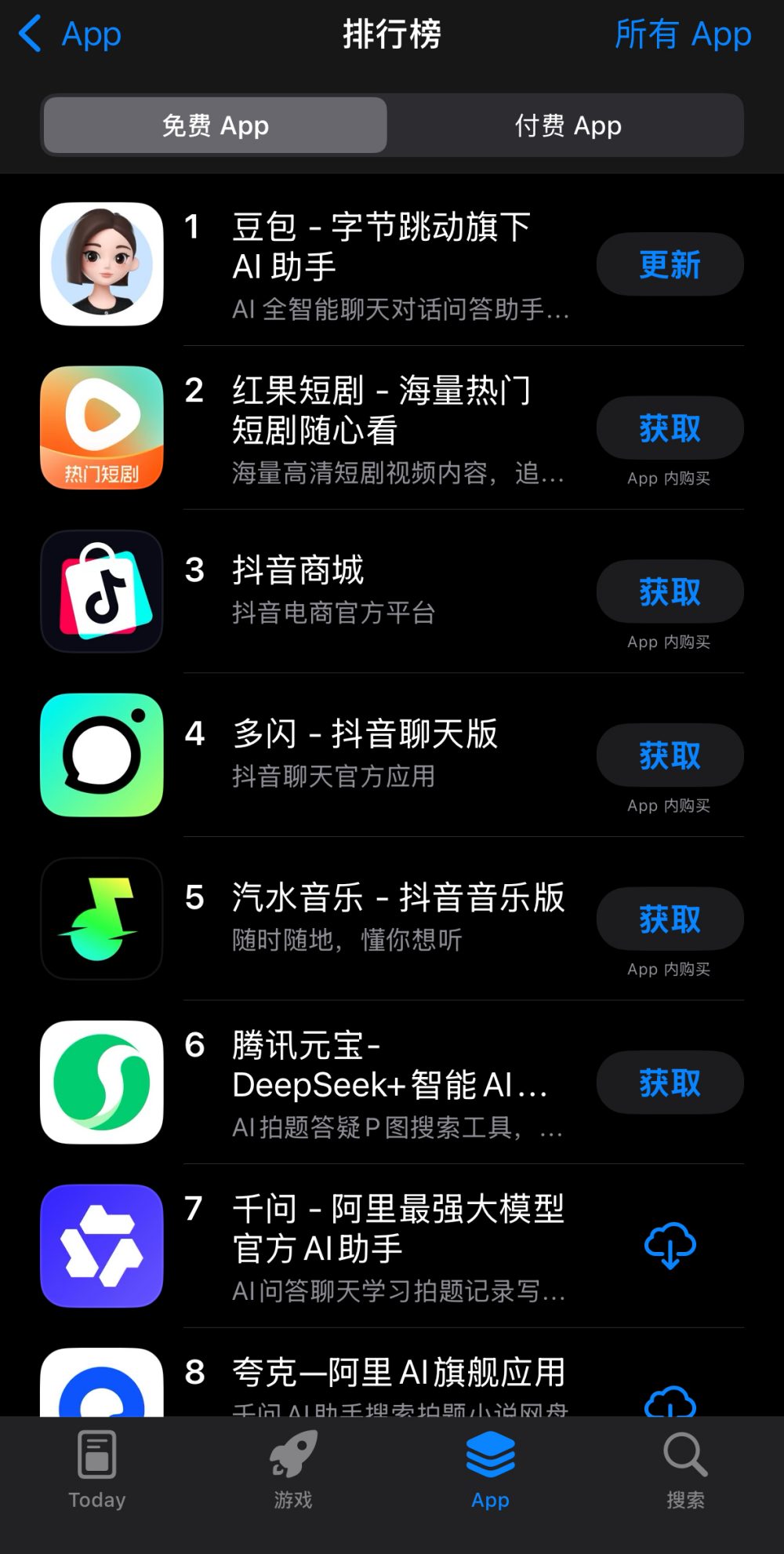 字节跳动“霸榜”苹果应用商店,免费榜前五中有四个来自抖音综合