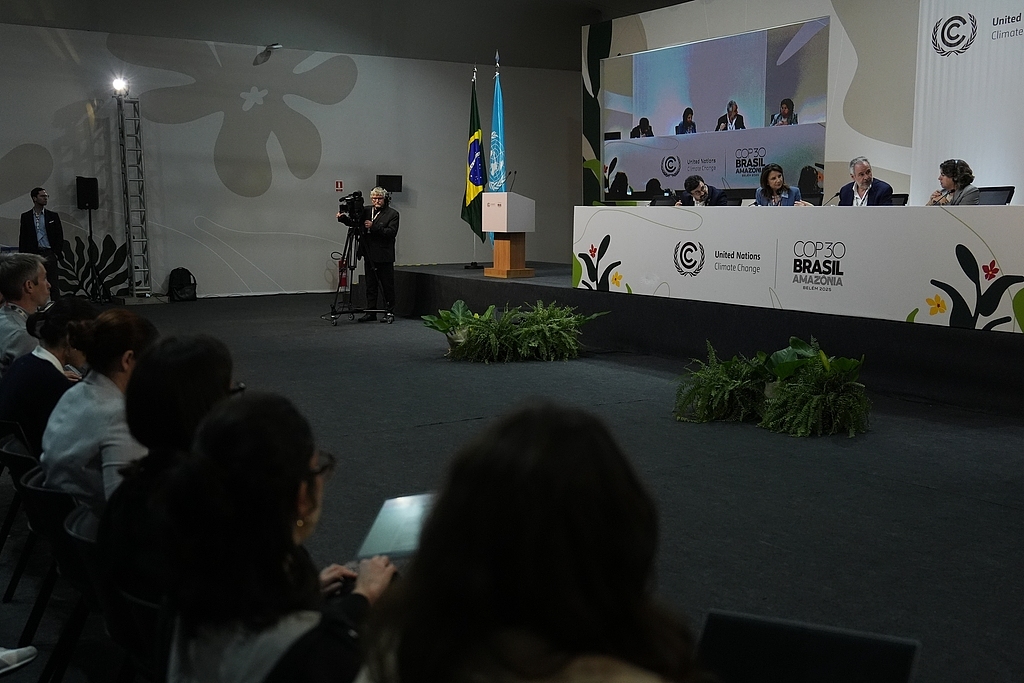 当地时间2025年11月15日,巴西贝伦,COP30联合国气候峰会期间举行新闻发布会。视觉中国图在巴...