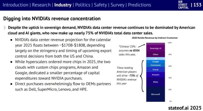 图注 :英伟达的数据中心收入高度集中:到2025年,美国云计算与AI巨头(如微软、Meta、亚马逊、谷歌等)将贡献其约75%的营收,形成对少数客户的深度依赖。