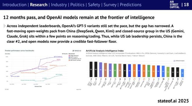 报告显示,OpenAI 依然位于模型能力的前沿。其 GPT-5 在多个基准测试中领先,但优势正在被缩小。谷歌 DeepMind 的 Gemini 系列快速追赶,而中国的开源生态则在速度与规模上“全面爆发”。