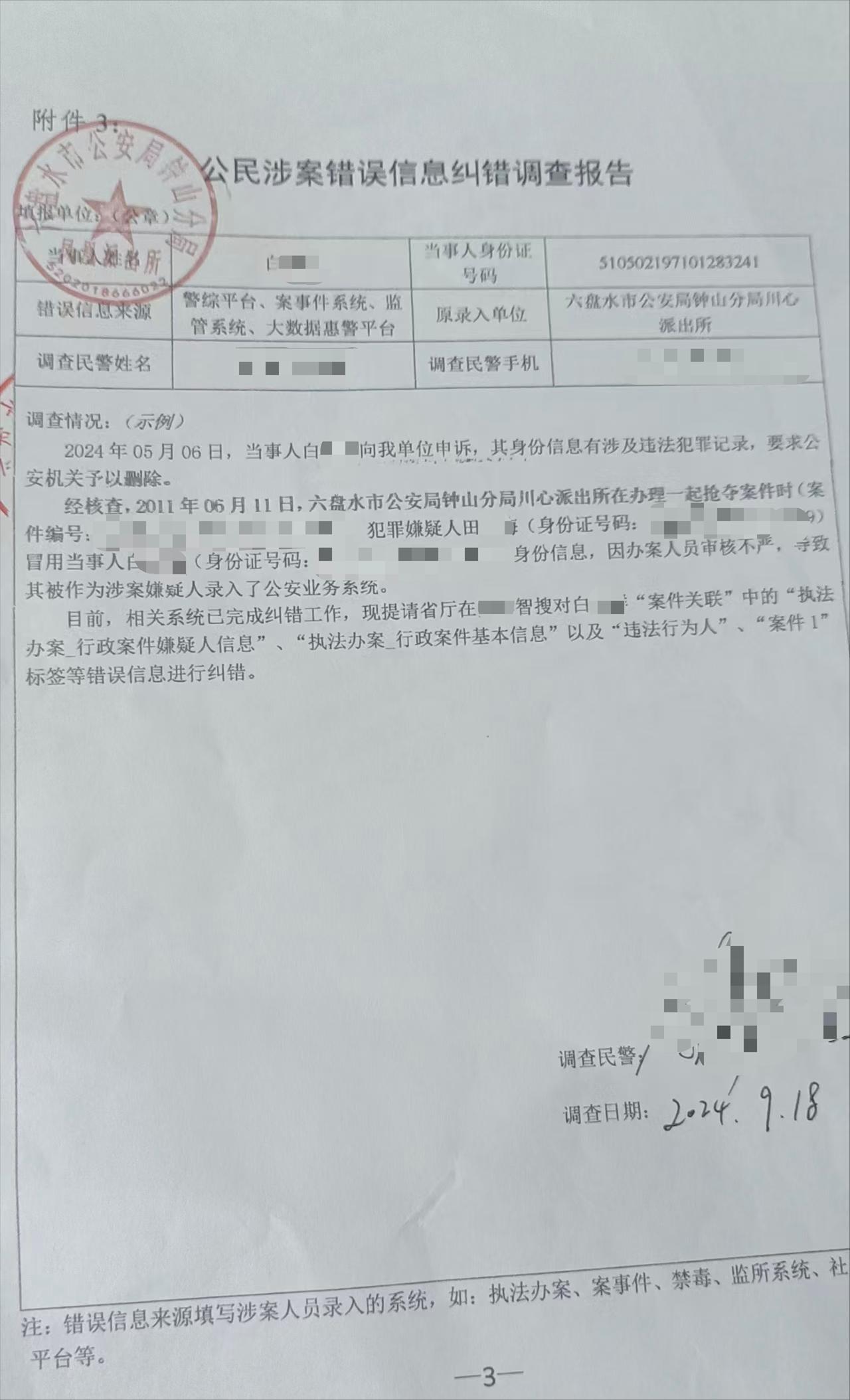 一份六盘水市公安局钟山分局凤凰派出所于2024年9月出具的《公民涉案错误信息纠错调查报告》中写道:因2011年该局川心派出所在办理抢夺案时,办案人员审核不严,导致白女士被作为涉案嫌疑人录入了公安业务系统。报告中提到,目前相关系统已完成纠错工作,提请省厅在相关公安信息搜索系统的错误信息进行纠错。