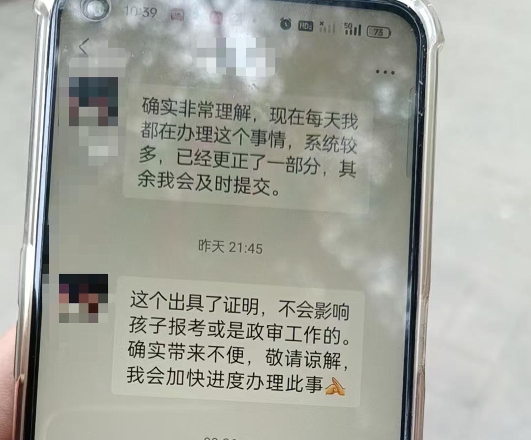 记者在二人聊天记录中看到,刘警官称:“系统较多,已经更正了一部分,其余我会及时提交”;并表示“出具了证明就不会影响孩子报考或政审工作”“会加快进度办理此事”。