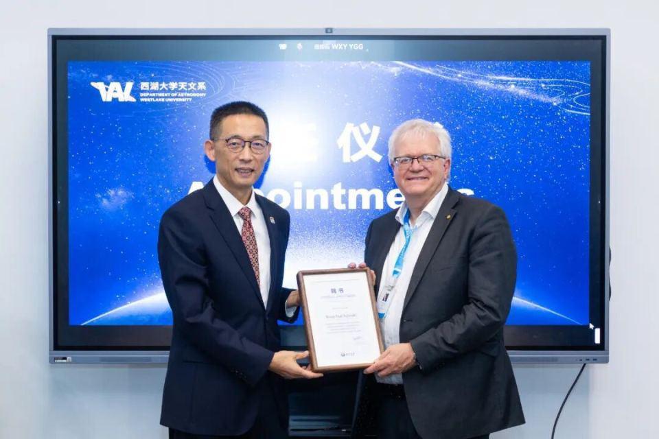 当天,澳大利亚国立大学第 12 任校长、2011 年诺贝尔物理学奖得主、美国国家科学院院士 Brian Schmidt,莱顿大学分子天体物理教授、国际天文联合会前主席 Ewine van Dishoeck,加州大学圣塔克鲁兹分校天体物理学荣休教授、美国科学与艺术学院院士 Douglas Lin(林潮)亲临现场,受聘为西湖大学天文系国际顾问委员会委员。