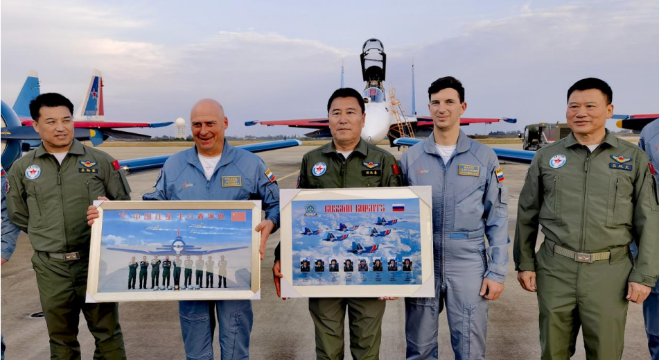 中俄两支飞行表演队在热烈友好的气氛中互赠礼物。“红星”送给“勇士”的是初教-6飞行员全家福,“勇士”送给“红星”的是苏-35S飞行员全家福。中俄双方飞行员表示,航空文化和航空情怀跨越国界、弥足珍贵,同场飞行共舞蓝天既增进了两国飞行员的友谊,也向社会公众展示了飞行表演的独特魅力。