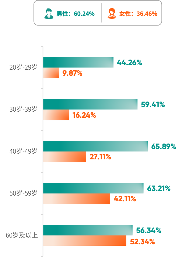 绿皮书显示,银行及保险高净值客户体重指数(BMI)增高检出率为52.87%,男性检出率超7成,并且在各个年龄段的检出率都高于女性,主打一个“稳重”。