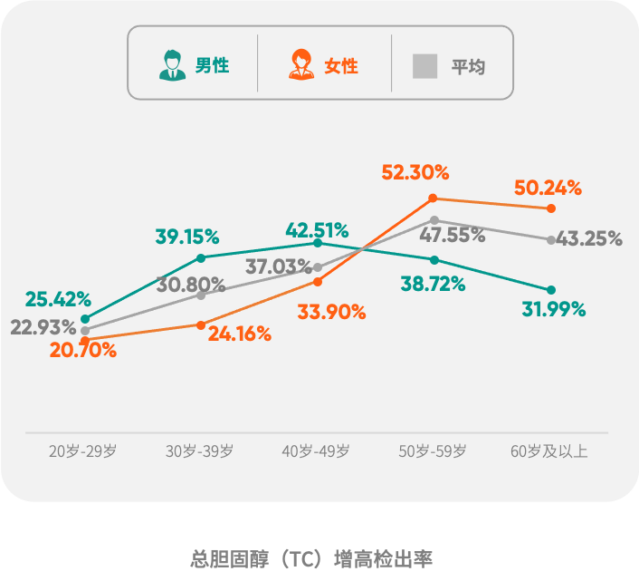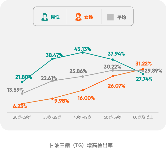 根据绿皮书甘油三酯(TG)增高、总胆固醇(TC)增高、低密度脂蛋白胆固醇(LDL-C)增高的性别年龄分布情况显示:总体来看,50岁-59岁银行及保险高净值客户检出率最高,分别为30.22%、47.55%和35.26%。