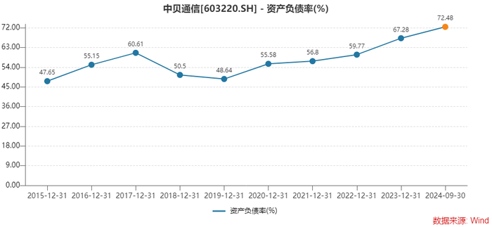 截至2024年9月30日,中贝通信资产负债率为72.48%,处于相对较高水平。本次募集资金部分用于偿还银行借款,以改善公司资本结构。