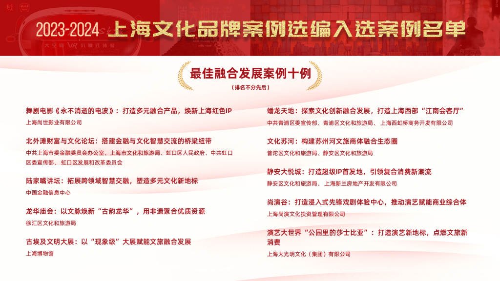 在市委宣传部的指导下,上海格物文化发展研究院和中国金融信息中心联合开展了2023-2024上海文化品牌案例选编工作。3月14日下午,2023-2024上海文化品牌案例选编成果发布会在中国金融信息中心召开,发布了最具影响力、最佳创新发展、最受市民欢迎、最佳融合发展、最佳海外传播等5类50个上海文化品牌最佳案例。