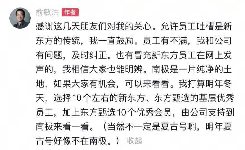 同时俞敏洪在评论区表示,“允许员工吐槽是新东方的传统,我一直鼓励。员工有不满,我和公司有问题,及时纠正。” 2026 年冬天,俞敏洪会选择 10 个左右的新东方、东方甄选的基层优秀员工,加上东方甄选 10 个优秀会员,由公司支持到南极来看一看。