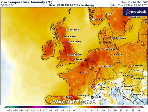 GFS天气模型显示,3月20日下午6点,英格兰北部和苏格兰南部的气温可能上升到惊人的17摄氏度。英格兰中部和东部可能达到15摄氏度,而英国其他地区可能达到12摄氏度至14摄氏度。只有西南部沿海地区的气温不太可能达到12摄氏度。