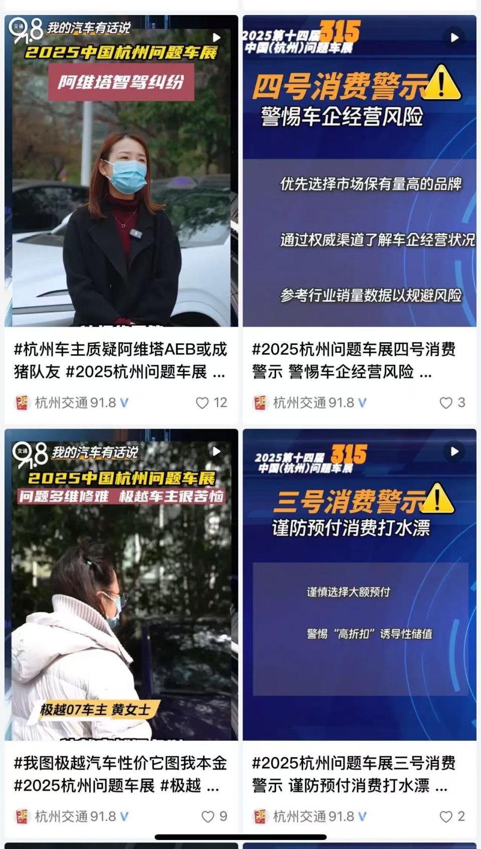 首页 > 科学 一年一度杭州问题车展:有车企阻拦车主入场,涉及诸多品牌 据杭州交通 91.8,一年一度的“杭州问题车展”举行,车主遇到的问题五花八门,很多车企工作人员冒雨蹲守,被指“有问题爱答不理,来车展穷追不舍”。有阿维塔车主质疑车辆 AEB 不灵。有极越车主对维修很苦恼。有车主在平台买到全损特斯拉。还有岚图、陆虎、凯迪拉克车主遇到各种问题。还有智界车主称前摄像头起雾导致智驾无法正常使用,来问题车展维权进场时遭遇阻拦。还有宝马、奥迪、蔚来、哪吒等品牌车主参展。