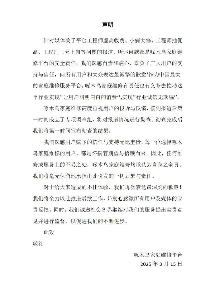 随后,啄木鸟家庭维修发布致歉声明