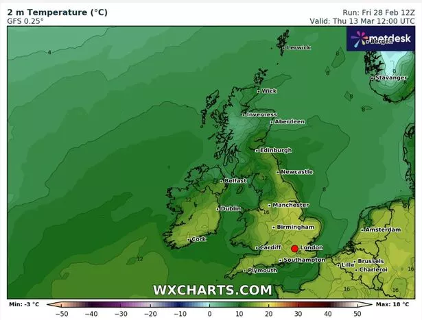 但一旦这场风暴消退,从3月12日开始,春天的天气就会开始好转。根据WX图表的另一张地图,北威尔士预计至少会有16摄氏度的高温。