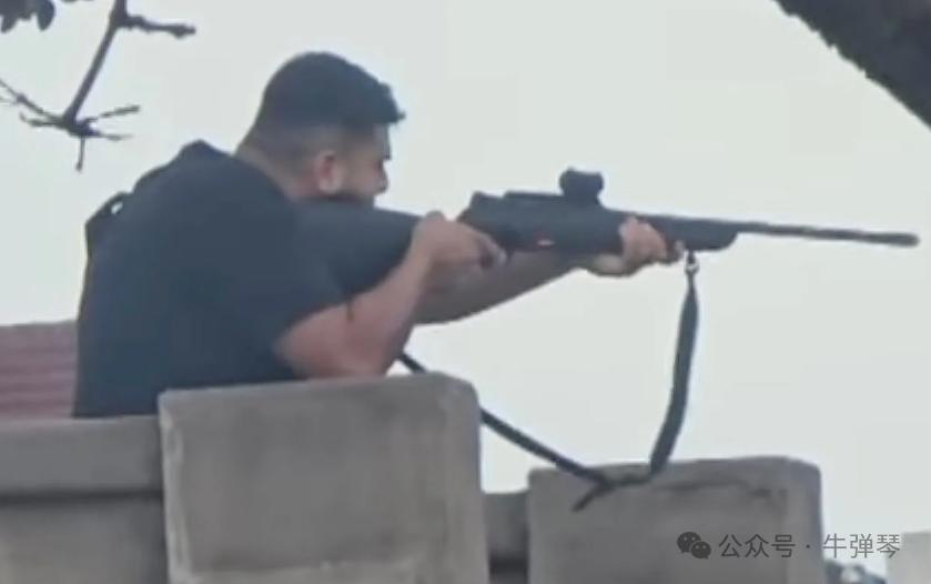 黑衣枪手正在开枪扫射,这名白衣男子,突然冲到他背后,一把抓住他的枪支,和他扭打在一起,然后将枪支夺到手中。