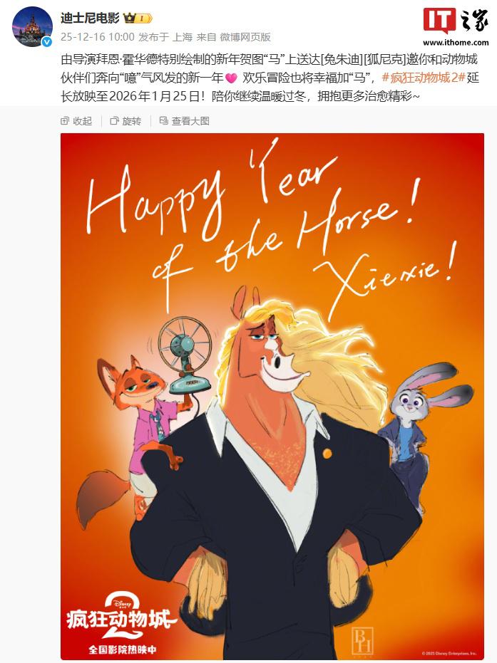 IT 之家 12 月 16 日消息,迪士尼电影官方今日宣布,《疯狂动物城 2》宣布延长放映至 2026 年 1 月 25 日。