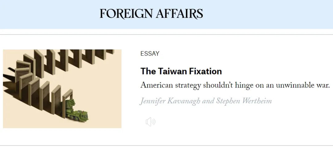 谭主注意到,最先在岛内引发这波震动的,是三周前美国知名期刊《外交事务》的一篇文章。多家岛内媒体认为,此文堪称“弃台论”的最新代表作,显示美国正围绕“台湾不重要”做舆论铺垫,放风造势。谭主翻看这篇题为《台湾执念:美国的战略不应押注于一场无法取胜的战争》的文章,发现它从军事和经济上对台湾的重要性进行了“切割”,不仅指出美国的区域利益不应受到台湾命运的影响,还强调美国正在积极布局国内的半导体产业,以应对“失去台湾”。无独有偶,美国内阁团队关键人物、国防部副部长提名人科尔比近日在听证会上表示,台湾并非美国“生死攸关”的利益,美国明确承诺“保卫”台湾成本大于收益。台湾“风传媒”直指,这可以看出,美国不仅不会为台而战,而且已经在为“弃台”预作布局。