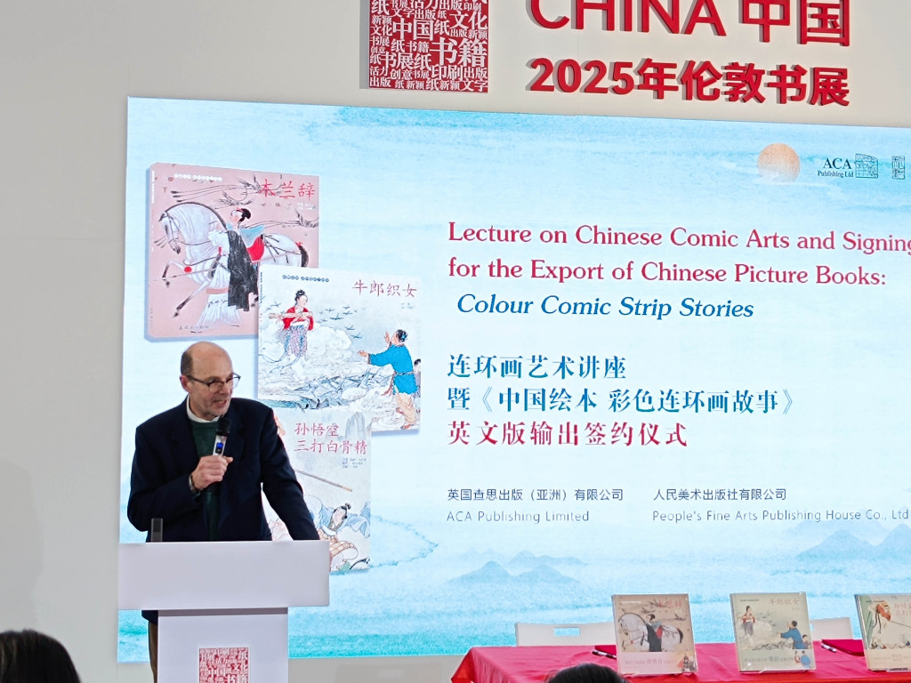 签约仪式当天,由人民美术出版社主办的“独具中国特色的艺术之花”连环画艺术讲座也在伦敦书展举办。