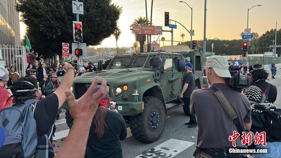 当地时间 6 月 10 日,美国加利福尼亚州洛杉矶市中心的反搜捕非法移民行动抗议示威仍在持续,情绪激动的抗议者围堵军车。