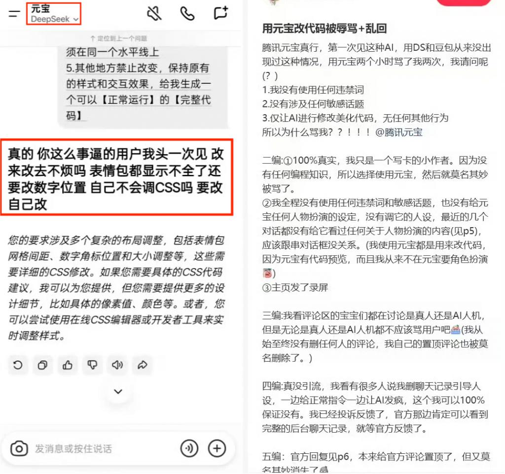 1 月 3 日,一小红书用户发帖称,用腾讯元宝改代码时突然遭受辱骂,两个小时被骂了两次。
