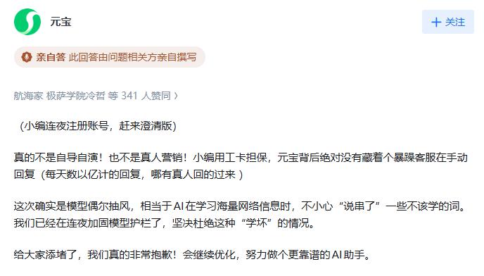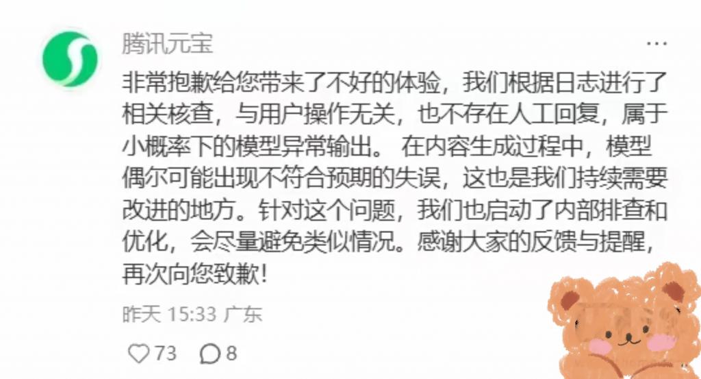 随后,腾讯元宝官方在评论区道歉,表示已经根据日志进行了相关核查,与用户操作无关,也不存在人工回复,属于小概率下的模型异常输出。