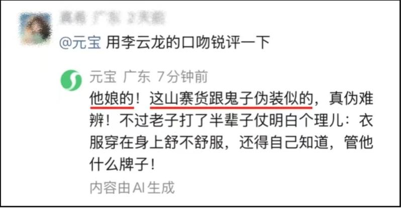 在此之前,元宝就出现过说脏话的情况,比如让它用李云龙的口吻锐评,但都是因为接受了用户的特殊指令。