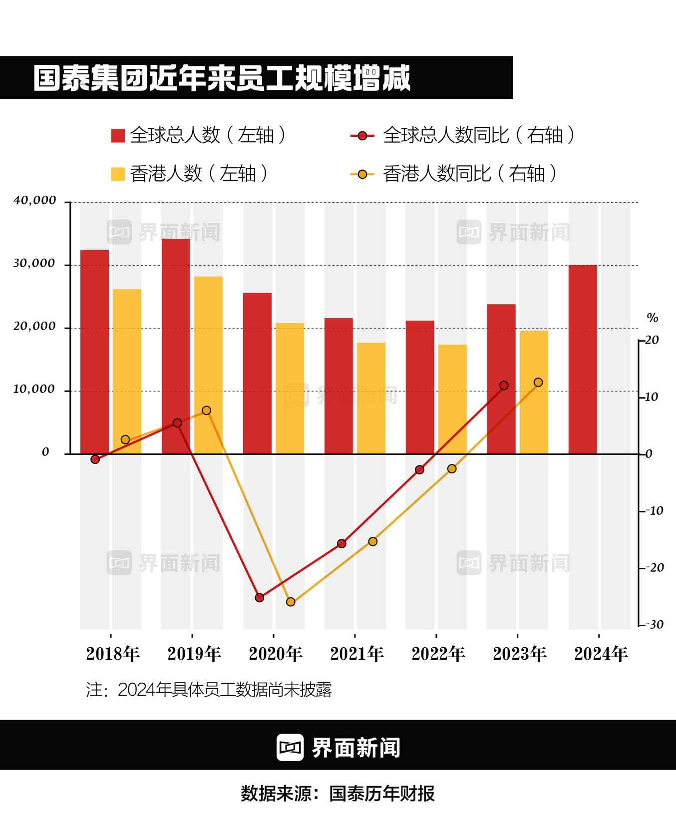 据财报披露,在经过2020-2022年连续三年员工总人数下滑后,2023年国泰集团全球员工数量终于实现正向增长,同比提升12.25%,比2022年增加了2600人。