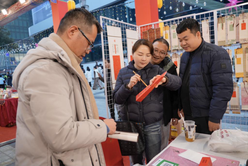 在解放碑重百新世纪年货市集上,漆画、扎染、书法画等各类非遗产品纷纷披上了 " 新年装 "。采用扎染技艺制作的小马布袋、融入宋锦文化的刺绣 " 福 " 字、书写着 " 吉祥如意 "" 马上成功 " 等吉语的书法画……巧妙融入了马年意象与新春吉祥元素,吸引众多市民和游客驻足。