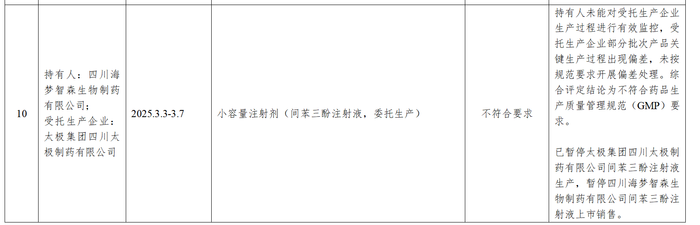 据国家组织药品联合采购办公室(下称“国家联采办”)介绍,此次取消中选资格的间苯三酚注射液持有人为海梦智森生物,四川太极则受委托生产。该药品为第十批国家组织药品集中采购(下称“第十批集采”)中选药品,目前尚未执行。