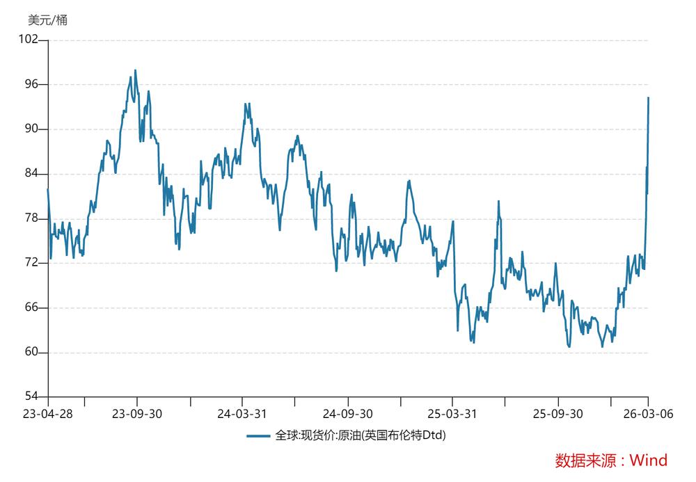 2026 年 3 月 6 日,原油(英国布伦特 Dtd)价格上涨至 94.35 美元 / 桶,逼近前期高点。最直接的催化就是中东战火再起,作为全球能源运输体系中核心咽喉通道的霍尔木兹海峡被封航,甚至伊拉克和科威特受出口限制,被迫减产。