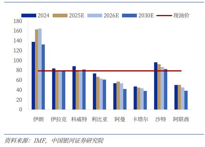 正如中国银河证券所研究的,伊朗,伊拉克,科威特,利比亚财政预算盈亏平衡油价分别为 137.7 美元 / 桶、83.8 美元 / 桶、88.2 美元 / 桶和 73.5 美元 / 桶。