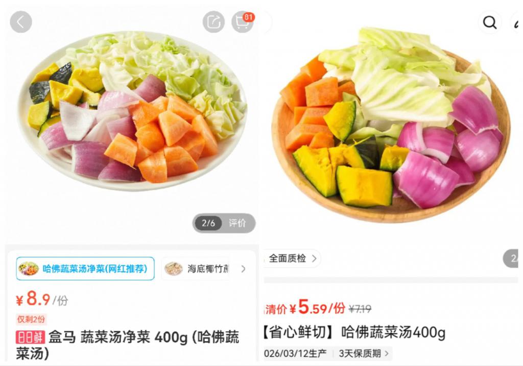 但即便如此,该产品仍在多个地区占据盒马净菜销量榜第一名,甚至带动了不少网友在社交平台上分享各种 " 爆改蔬菜汤 " 帖子。