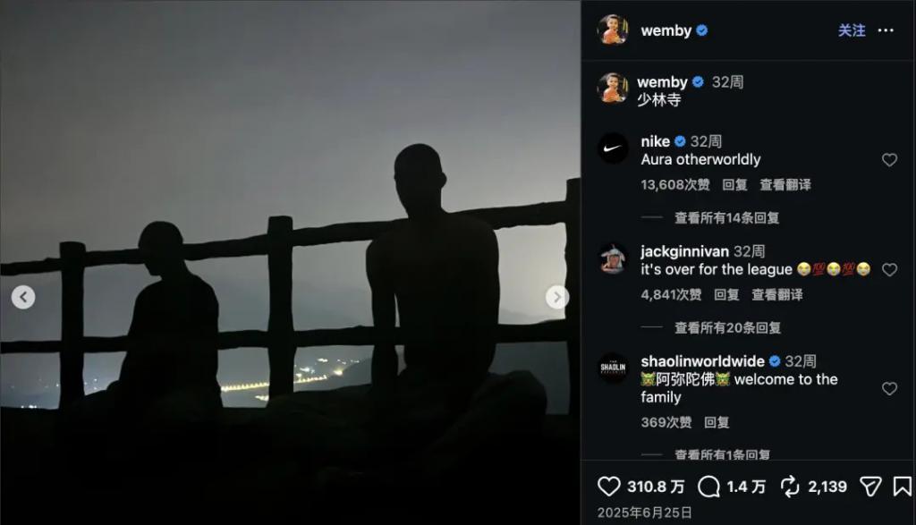 文班亚马团队,就是通过洛杉矶积淀已久的少林文化氛围接触到了少林功夫。他们看到,少林功夫强调自律、利他与内心平静。沟通接洽敲定细节后,2025 年 6 月,文班亚马来了中国。