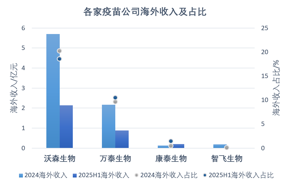 据沃森生物2025年中报,目前公司产品已累计出口24个国家和地区,累计出口数量超6300万剂。2024年和2025年上半年,沃森生物海外营收分别为5.70亿元、2.14亿元,约占总营收的20%,在绝对值和占比上远高于同行。另据2025年业绩预告,公司当期出口疫苗产品收入同比增长约35%。