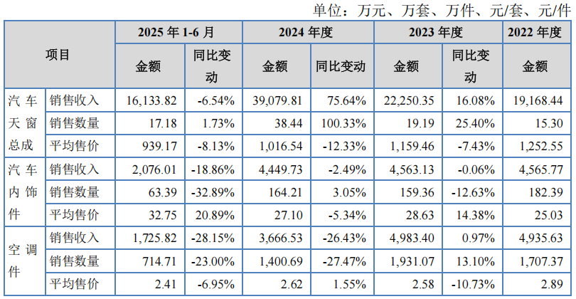 从募资用途来看,天运股份拟募集2.25亿元,其中1.15亿元用于汽车天窗及天幕扩产项目,3321.75万元用于车用功能性新材料扩产项目,4685.12万元用于研发中心建设,3000万元补充流动资金。2024年天运股份汽车天窗总成产能利用率已达199.92%,处于严重超负荷状态,扩产势在必行。但矛盾的是,2025年上半年天运股份汽车天窗收入为1.67亿元,同比下降6.54%,销量仅微增1.73%,而售价同比下降8.13%。在产能极度紧张的情况下,业绩反而出现下滑,这让新增产能的消化前景蒙上阴影。