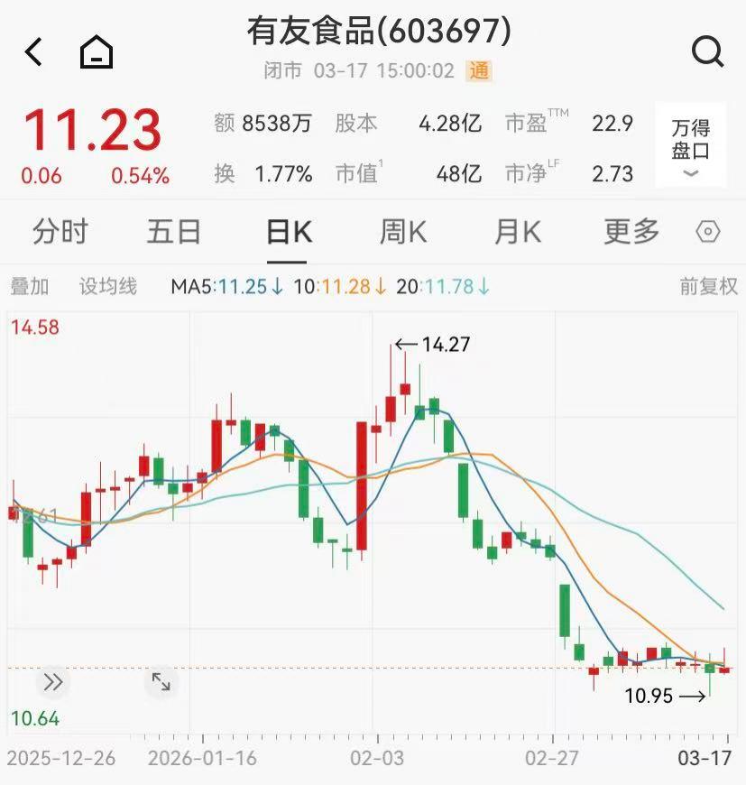 截至 3 月 17 日,有友食品报 11.23 元 / 股,市值 48 亿元,今年以来其股价一路下探,目前已累计下跌超 8%。