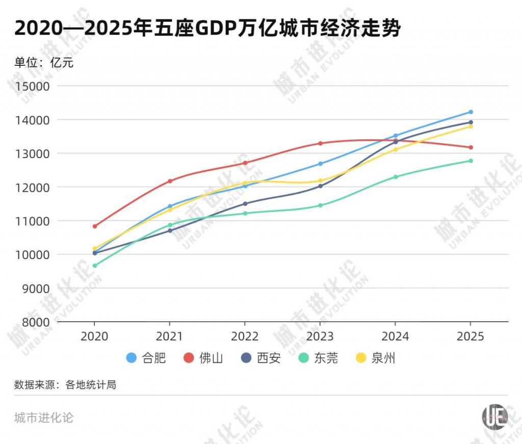 2025 年,佛山经济在多重挑战下增速放缓,是 29 个万亿城市中唯一名义负增长的城市。而回顾 " 十四五 ",佛山经济总量先后被合肥、西安等城市赶超,核心原因正是新兴产业发展乏力。身为 " 全国工业第四城 ",佛山却尚未能培育出与自身地位相匹配的新兴产业体量。