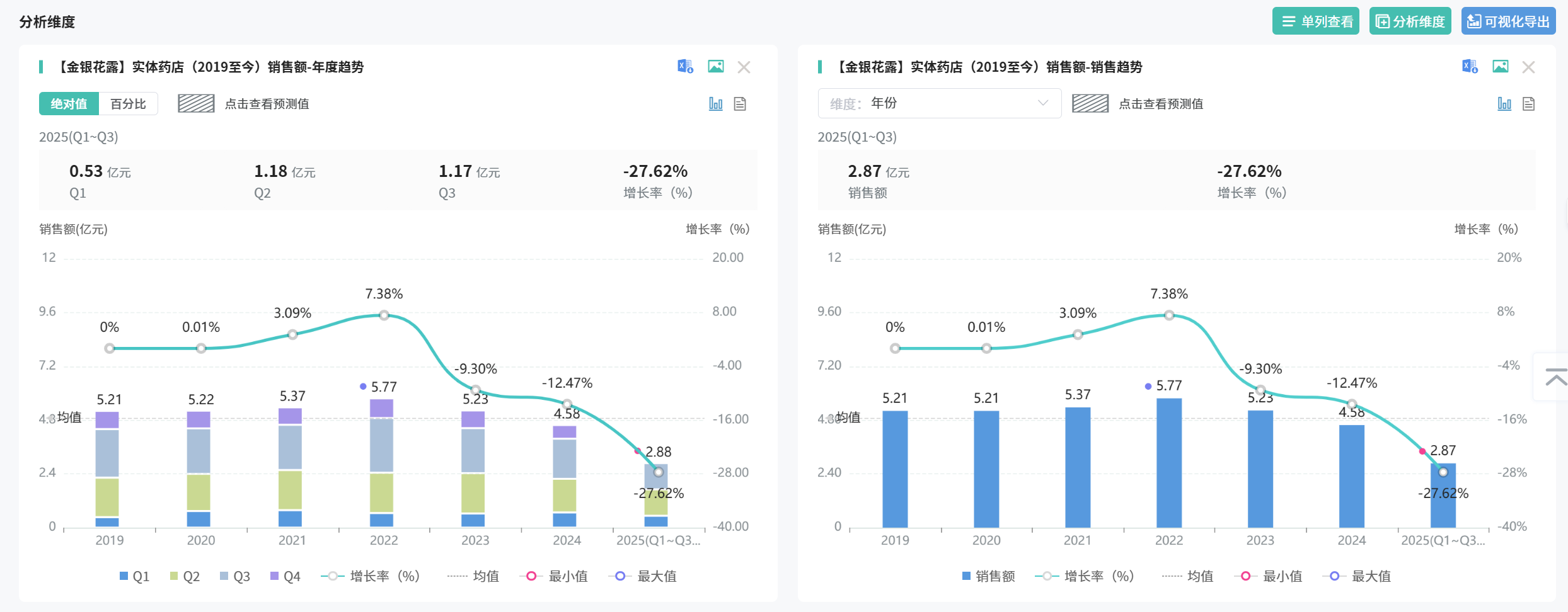 金银花露常被消费者误认为是消暑解渴的饮品,但在药店渠道销售的产品中,绝大多数是非处方药。据摩熵医药数据,2019年至2025年前三季度,金银花露在实体药店销售总额合计约34.24亿元。金银花露的的主要生产企业包括葵花药业、湖北午时药业、湖北虎泉药业、湖北济安堂药业等。