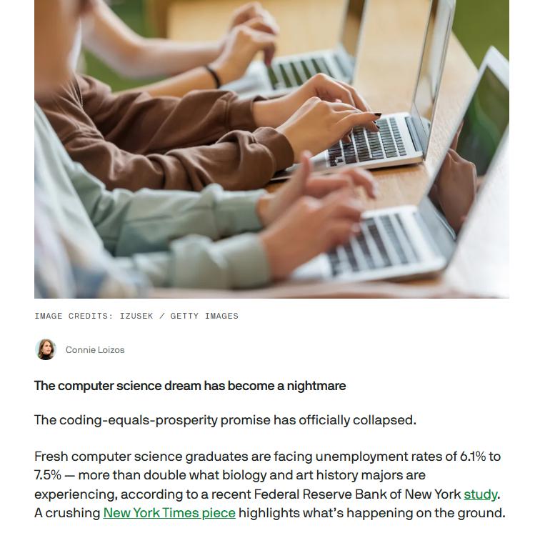 而曾经计算机科学的梦想已经变成了噩梦," 编程等于繁荣 " 的说法已经正式破灭。《纽约 · 时报》文章显示,根据纽约联邦储备银行最近的一项研究,美国计算机科学专业应届毕业生的失业率高达 6.1% 至 7.5%,是生物学和艺术史专业毕业生失业率的两倍多。
