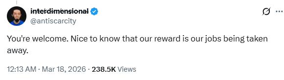 面对这种 " 端起碗吃饭,放下筷子砸锅 " 的发言,X 上的网友们瞬间炸了。虽然有一些人直抒胸臆地表达愤怒:" 不客气。很高兴知道我们得到的奖励是被抢走饭碗。"