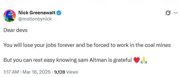 " 亲爱的开发者们,你们将永远失去工作,并被迫去煤矿挖煤。但你们大可以高枕无忧了,因为知道 Sam Altman 对你们心存感激。❤️"