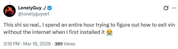 【打工人破防组】 网友 @lonelyguyse1 留下了时代的眼泪:" 太真实了 …… 我第一次装 Vim 的时候,没网的情况下花了整整一个小时才搞明白怎么退出。"