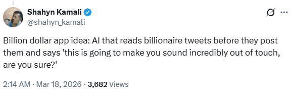 " 价值十亿美元的 App 点子:开发一款 AI,专门在亿万富翁发帖前阅读他们的推文,然后提醒他们‘这句话会让你显得极度不知民间疾苦,你确定要发吗?’ "