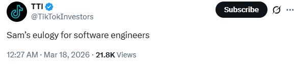 【地狱笑话组】 有人评价这条帖子:" 这是 Sam 给软件工程师写的悼词。" 还有人说:" 这读起来,就像玛雅人在活人献祭仪式开始前会对祭品说的话。"