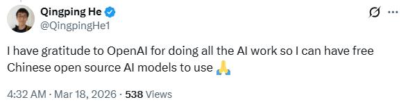 "我对 OpenAI 做出的所有 AI 工作充满感激,因为这样我就可以免费使用中国开源的 AI 模型了。"